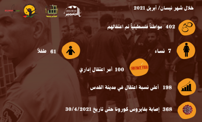 اعتقلت قوات الاحتلال الإسرائيلي خلال شهر نيسان/ أبريل 2021، (402) مواطنًا فلسطينيًا، بينهم (61) طفلًا، و(7) نساء، ووصل عدد أوامر الاعتقال الإداريّ الصادرة بحقّ المعتقلين (100) أمر اعتقالٍ إداريّ، بينهم (52) أمر جديد، و(48) أمر تجديد.