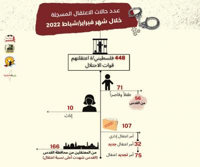اعتقلت سلطات الاحتلال الإسرائيلي خلال شهر شباط/فبراير 2022، (448) فلسطيني/ة من الأرض الفلسطينية المحتلّة، من بينهم (71) طفلاً، و(10) من النساء.