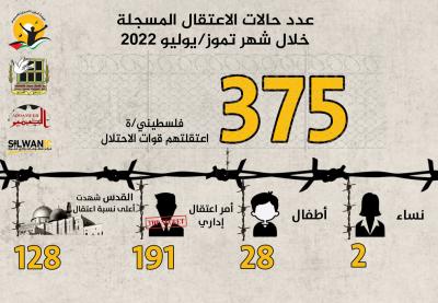 اعتقلت سلطات الاحتلال الإسرائيلي خلال شهر تموز/ يوليو 2022، (375) فلسطيني/ة من الأرض الفلسطينية المحتلّة، بينهم (28) طفلاً، وسيدتان، وبلغ عدد أوامر الاعتقال الإداريّ الصّادرة (191) أمراً، بينها (65) أمراً جديداً، و(126) أمر تمديد.