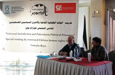 رام الله المحتلة - 12/23/2013 - نظمت مؤسسة الضمير لرعاية الأسير وحقوق الإنسان تدريباً لعدد من المحامين الفلسطينيين، حول الولاية القضائية العالمية وارتباطها بالأسرى السياسيين الفلسطينيين في رام الله أمس.