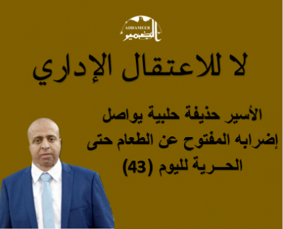 تحذر مؤسسة الضمير من خطورة الوضع الصحي للأسير حذيفة في يومه ال(43)، وتدين بشدة الاقتحام الذي نفذته الوحدات الخاصة لزنزانة الأسير حذيفة وما رافقه من انتهاكات بحق أسير مضرب عن الطعام لتحقيق مطالبه المشروعة، بما بخالف كافة المواثيق والأعراف الدولية. تطالب مؤسسة الضمير المجتمع الدولي والدول الأعضاء الموقعة على اتفاقية جنيف الرابعة بالضغط على دولة الاحتلال لوقف الانتهاكات التي يتعرض لها الأسير حذيفة والإفراج الفوري عنه بعد تفاقم حالته الصحية، ولإنهاء سياسة الاعتقال الإداري التعسفي.