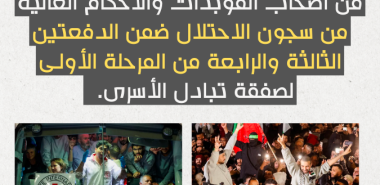 الاحتلال يفرج عن 369 أسيرًا ضمن الدفعة السادسة من المرحلة الأولى من صفقة التبادل بين الاحتلال والفصائل الفلسطينية.