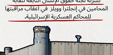 ترحب مؤسسة الضمير بنتائج التقرير الذي نشرته لجنة حقوق الإنسان التابعة لنقابة المحامين في إنجلترا وويلز (BHRC) في أعقاب جولتها الرقابية للمحاكم العسكرية الإسرائيلية.