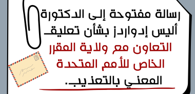 رسالة مفتوحة إلى الدكتورة اليس إدواردز بشأن تعليق التعاون مع ولاية المقررة الخاصة للأمم المتحدة المعنية بالتعذيب.
