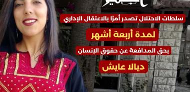 سلطات الاحتلال تصدر أمرًا بالاعتقال الإداري بحق المدافعة عن حقوق الإنسان ديالا عايش لمدة أربعة أشهر.