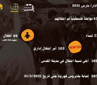 مؤسسات الأسرى: الاحتلال اعتقل خلال شهر آذار/ مارس 2021، (438) فلسطينياً/ة