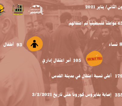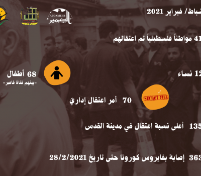 مؤسسات الأسرى: الاحتلال اعتقل خلال شهر شباط/ فبراير 2021، (415) فلسطيني/ة