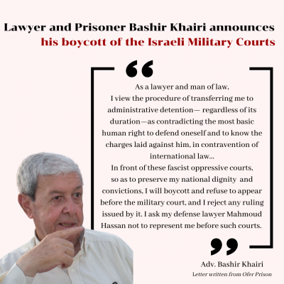 The confirmation hearing for the administrative detention order was set to 9 December 2021, then postponed to 14 December. Yet, in light of the farcical military judicial proceedings poorly masking Israeli occupation authorities' persecution attempt, Mr. Khairi announced in a letter, on the same day, his intent to boycott all further military court proceedings. Mr. Khairi writes, "In order to harmonize myself as a lawyer and a man of law, I see this procedure of transferring me to administrative detention, regardless of its duration, as contradicting the most basic of human rights to defend oneself and to see the charges laid against oneself, and that is in violation of international law...I ask that my defense lawyer, Adv. Mahmoud Hassan, not represent me before such courts."