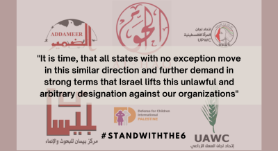 The six Palestinian civil society organizations welcome recent steps taken by States and Lawmakers following Israel’s settler-colonial and apartheid regime’s arbitrary and baseless designation of the six leading Palestinian human rights and civil society organizations (CSOs) as “terror organizations” under Israel’s vague 2016 Counter-Terrorism Law, which was later extended into the occupied Palestinian territory (OPT) by declaring the organizations to be “unlawful associations” under Israeli military orders. We emphasize that such steps are in the right direction and essential for the protection of civil society and human rights defenders in Palestine.