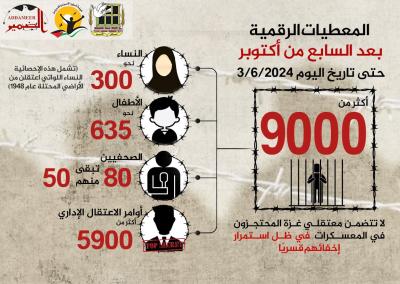 Data does not include detention cases of Gaza, due to the occupation’s refusal to give any information and the continuation of practicing the crime of enforced disappearance against them. It is worth mentioning that the occupation forces arrested hundreds of Gazan workers in the West Bank, in addition to citizens from Gaza who were previously in the West Bank for medical treatment.