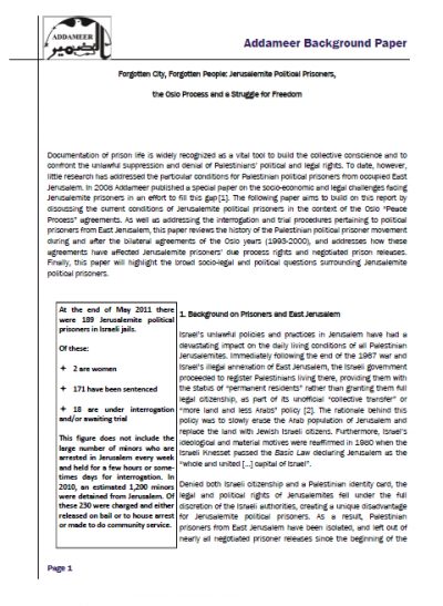 Documentation of prison life is widely recognized as a vital tool to build the collective conscience and to confront the unlawful suppression and denial of Palestinians’ political and legal rights. To date, however, little research has addressed the particular conditions for Palestinian political prisoners from occupied East Jerusalem. In 2008 Addameer published a special paper on the socio-economic and legal challenges facing Jerusalemite prisoners in an effort to fill this gap [1]. The following paper aims to build on this report by discussing the current conditions of Jerusalemite political prisoners in the context of the Oslo “Peace Process” agreements. As well as addressing the interrogation and trial procedures pertaining to political prisoners from East Jerusalem, this paper reviews the history of the Palestinian political prisoner movement during and after the bilateral agreements of the Oslo years (1993-2000), and addresses how these agreements have affected Jerusalemite prisoners’ due process rights and negotiated prison releases. Finally, this paper will highlight the broad socio-legal and political questions surrounding Jerusalemite political prisoners.