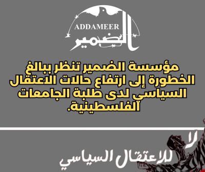 تنظر مؤسسة الضمير لرعاية الأسير وحقوق الإنسان ببالغ الخطورة إلى مواصلة الأجهزة الأمنية الفلسطينية حملات الاعتقال السياسي بحق طلبة الجامعات الفلسطينية، حيث أقدمت الأجهزة الأمنية في الأيام الأخيرة على اعتقال خمسة طلاب من جامعة بيرزيت، وقام جهاز المخابرات الفلسطينية العامة باعتقال الطالب ورئيس مجلس اتحاد الطلبة القادم في الجامعة عبدالمجيد حسن عشيّة تشكيل مجلس اتحاد الطلبة، وكان حسن قد تعرض للاعتداء بالضرب المبرح أثناء عملية اعتقاله أمام منزله، إضافة إلى استمرار الأجهزة الأمنية اعتقال كل من يحى قاسم وعبدالله أبو قياص وعبد الغني فارس وفوزي أبو كويك، وجميعهم طلاب في جامعة بيرزيت، وتأتي حملة الاعتقالات السياسية المستمرة في مختلف جامعات الضفة الغربية بعد أيام قليلة من انتخابات مجالس اتحاد الطلبة في تلك الجامعات.