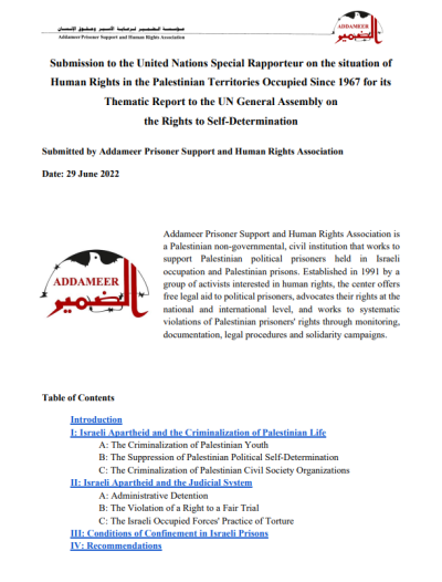 Addameer Prisoner Support and Human Rights Association submitted input to the United Nations Special Rapporteur on the situation of human rights in the Palestinian territories occupied since 1967 to contribute to the formation of a larger thematic report focusing on the status of the right of self-determination for the Palestinian people. Addameer joined fellow contributors from local and regional governments, national human rights institutions, human rights defenders, and civil society organizations to address the most grievous violations of the Palestinian People’s right to self-determination and the ways in which the denial of the right to self-determination affects key aspects of life in the oPt.