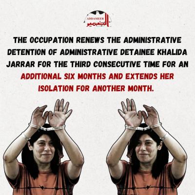 Today, Tuesday, the occupation authorities renewed the administrative detention order for detainee Khalida Jarrar – a human rights and feminist activist, and former member of the Palestinian Legislative Council – for an additional six months. She was arrested on December 26, 2023, and was subjected to an arbitrary administrative detention order for six months, which has since been renewed twice.