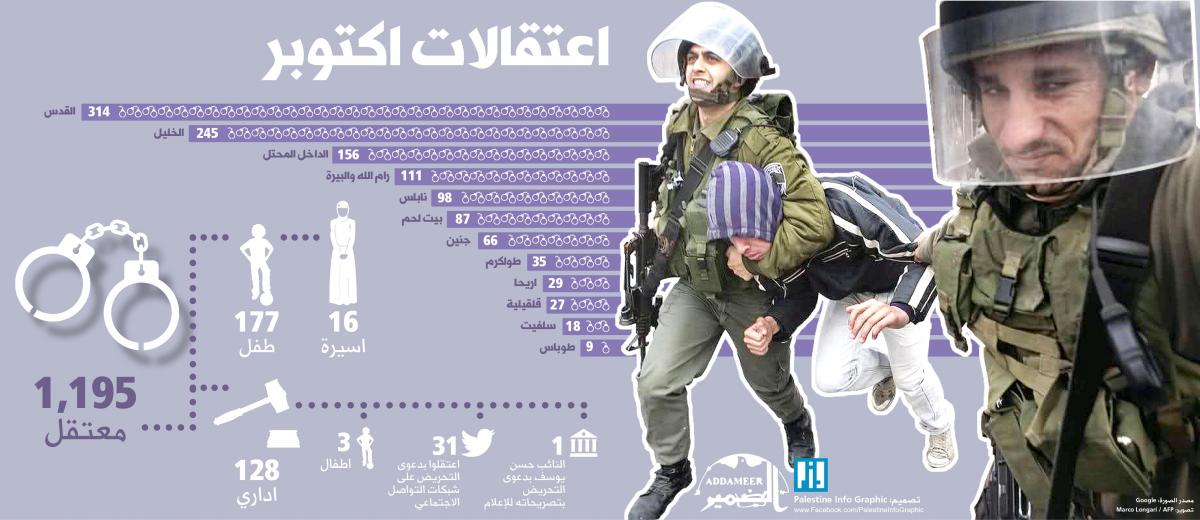 وأصدرت قوات الاحتلال منذ بداية الهبة الشعبية الفلسطينية وحتى نهاية شهر أكتوبر الماضي 128 أمر اعتقال إداري جديد، حوالي 31 منهم بسبب النشاط على وسائل التواصل الاجتماعي، وكانت 3 أوامر بحق أطفال من القدس.