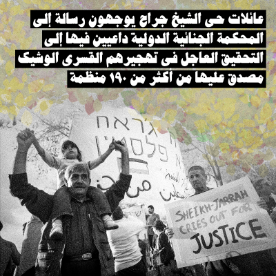 بتاريخ 22 نيسان / أبريل 2021، أرسل ممثلون وممثلات عن 28 عائلة فلسطينية من حي الشيخ جراح في القدسويمثلون أكثر من5٠٠ فلسطيني وفلسطينية،إضافة إلى 191 منظمة داعمة رسالة إلى مكتب المدعية العامة للمحكمة الجنائية الدولية، يطالبون فيها بالإدراج العاجل للتهجير القسري الوشيك للفلسطينيين من حي الشيخ جراح في إطار التحقيق الجاري في الحالة في فلسطين.وعلى وجه التحديد، دعت العائلات مكتب المدعية العامة إلى تضمين جرائم الحرب والجرائم ضد الإنسانية ذات الصلة بتهجيرهم القسري كجزء من التحقيق، بما في ذلك النقل القسري، والاستيلاء على الممتلكات، والاضطهاد، والفصل العنصري، وغيرها من الأعمال اللاإنسانية التي تسبب معاناة شديدة أو أذى خطير يلحق بالجسم أو بالصحة العقلية أو البدنية.