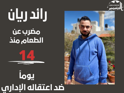 أفاد المعتقل الإداري رائد ريان المضرب عن الطعام منذ (14) يوماً احتجاجاً على اعتقاله الإداري التعسفي بعد زيارته، أنه يقبع في زنازين سجن عوفر، وبدأ إضرابه عن الطعام بتاريخ 7/4/2022، ونُقل إلى الزنازين حيث توقف عن شرب الماء لمدة 3 أيام بسبب وضعه في زنزانة مراقبة بالكاميرات وفي ظروفٍ صعبة. كما أفاد أنه يتم تقديم القهوة والطعام له بشكل يومي إلا أنه يقوم بالرفض. لم يُعرض المعتقل ريان على طبيب ولم يخضع لأي فحوصات طبية منذ بدأ إضرابه. كما أنه يعاني من ألم بالرأس، والم في المفاصل خاصة بعد أن توقف عن شرب الماء لثلاث أيام، إضافة إلى معاناته من ألم في الخاصرة والركب، ويواجه صعوبة في المشي.
