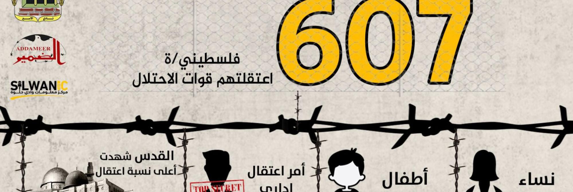 اعتقلت سلطات الاحتلال الإسرائيلي خلال شهر آب/ أغسطس 2022، (607) فلسطينيًا/ة من الأرض الفلسطينية المحتلّة، من بينهم (59) طفلاً، و(13) من النساء، وشكلت حالات الاعتقال في القدس النسبة الأعلى كما في كل شهر ، تليها الخليل، وبيت لحم، وجنين.