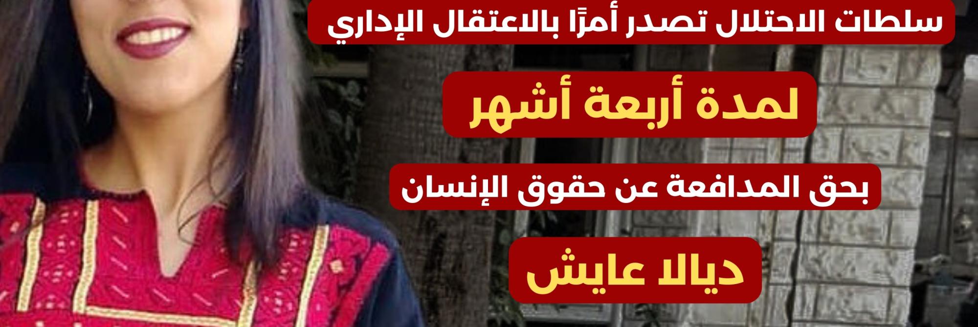 أصدرت سلطات الاحتلال اليوم الخميس 25/1/2024 أمرًا بالاعتقال الإداري التعسفي بحق المحامية الناشطة والمدافعة عن حقوق الإنسان ديالا عايش من مدينة البيرة لمدة أربعة أشهر، ينتهي بتاريخ 16/5/2024، وكانت عايش قد اعتقلت أثناء مرروها بحاجز "الكونتينر" العسكري الذي يفصل مدن جنوب الضفة الغربية عن باقي المحافظات، بعد أن تعرضت للاعتداء والتهديد والشتائم من قبل جنود الاحتلال أثناء عملية اعتقالها، وقام جيش الاحتلال بنقل عايش بعد اعتقالها إلى سجن "هشارون" في ظروف صعبة، حيث تم وضعها في زنزانة سيئة جدًا فيها شباك مفتوح رغم برودة الطقس، ثم قام الاحتلال بنقلها في اليوم التالي إلى سجن الدامون.
