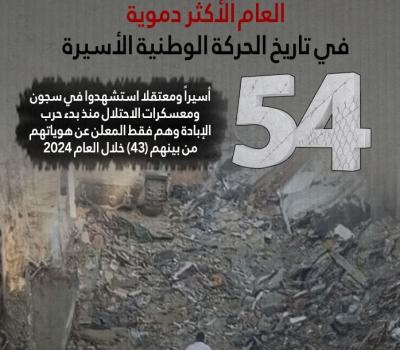 العام الأكثر دموية في تاريخ الحركة الوطنية الأسيرة 54 أسيراً ومعتقلا استشهدوا في سجون ومعسكرات الاحتلال منذ بدء حرب الإبادة وهم فقط المعلن عن هوياتهم من بينهم (43) خلال العام 2024 -يواصل الاحتلال إخفاء هويات عشرات الشهداء من غزة