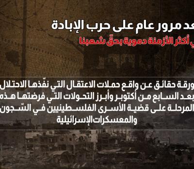 ورقة حقائق صادرة عن مؤسسات الأسرى عن واقع حملات الاعتقال التي نفّذها الاحتلال بعد السابع من أكتوبر وأبرز التحولات التي فرضتها هذه المرحلة على قضية الأسرى الفلسطينيين في السّجون والمعسكرات الإسرائيلية