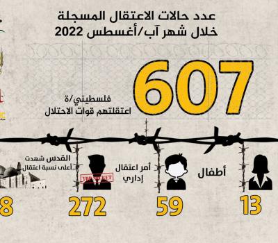 مؤسسات الأسرى: الاحتلال اعتقل (607) فلسطينياً خلال شهر آب /أغسطس 2022