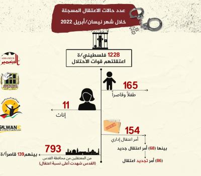 مؤسسات الأسرى: الاحتلال اعتقل (1228) فلسطينياً خلال شهر نيسان/أبريل 2022