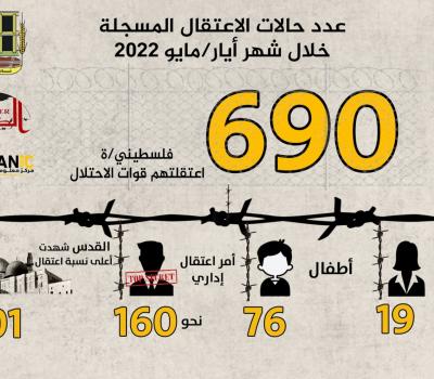 مؤسسات الأسرى: الاحتلال اعتقل (690) فلسطينياً خلال شهر أيار /مايو 2022