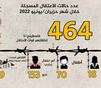 مؤسسات الأسرى: الاحتلال اعتقل (464) مواطن/ة خلال حزيران/يونيو الماضي و(3873) فلسطينياً خلال النصف الأول من العام 2022