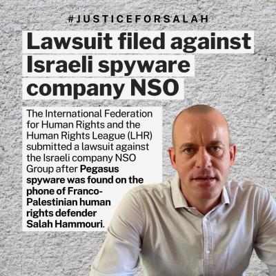 En octubre de 2021, Salah Hammouri se puso en contacto con FrontLine Defenders (de ahora en adelante FLD) para solicitar la examinación de su teléfono, tras descubrir la infiltración en los dispositivos de otras defensoras y defensores de los derechos humanos palestinos. En noviembre de 2021, FLD concluyó su investigación y confirmó sus hallazgos junto al Citizen Lab y Amnistía Internacional. La investigación reveló que tanto el teléfono del Sr. Hammouri como los teléfonos de otros defensores de los derechos humanos palestinos fueron hackeados por los servicios del Grupo NSO, una empresa tecnológica israelí conocida por su programa de espionaje Pegasus. Es así que, la investigación demostró que el teléfono del Sr. Hammouri había sido hackeado desde el abril de 2021. En diciembre de 2021, el Sr. Hammouri decidió acudir a la FIDH para que esta lo apoyara en la presentación de una denuncia judicial contra el Grupo NSO; el mismo que ha utilizado su software de espionaje para infiltrarse de forma ilegal en su teléfono, así como en toda su vida profesional y privada, privándolo entre otros derechos a su derecho a la privacidad.