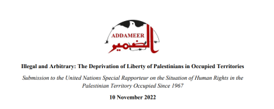 Addameer’s submission addresses these themes and questions by analyzing Israel’s use of arbitrary detention policies and practices to repress Palestinians' struggle for self-determination and liberty. The submission concludes that the increased systematic practice of arbitrary detention undertaken by the Israeli occupation forces is upheld by the Israeli settler-colonial and apartheid regime. Violence is imbued at each stage of arrest: upon arrest and transfer to detention centers and during detention and trial. These methods of deprivation of liberty are central to the practices of the Israeli occupation, yet they are differentially applied geographically across the occupied Palestinian territories in violation of international law.