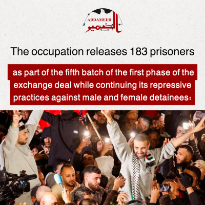 As part of the implementation of the first phase of the prisoner exchange deal, the occupation authorities released 183 Palestinian prisoners on Saturday, February 8, 2025. This batch included 18 prisoners sentenced to life imprisonment, 54 prisoners with high sentences, and 111 prisoners from Gaza who were arrested after October 7, 2023. Additionally, seven prisoners sentenced to life imprisonment were forcefully deported to Egypt as an initial stop before being transferred to other countries. This release comes amid the continued implementation of the exchange deal, while prisoners endure harsh conditions in the occupation’s prisons.