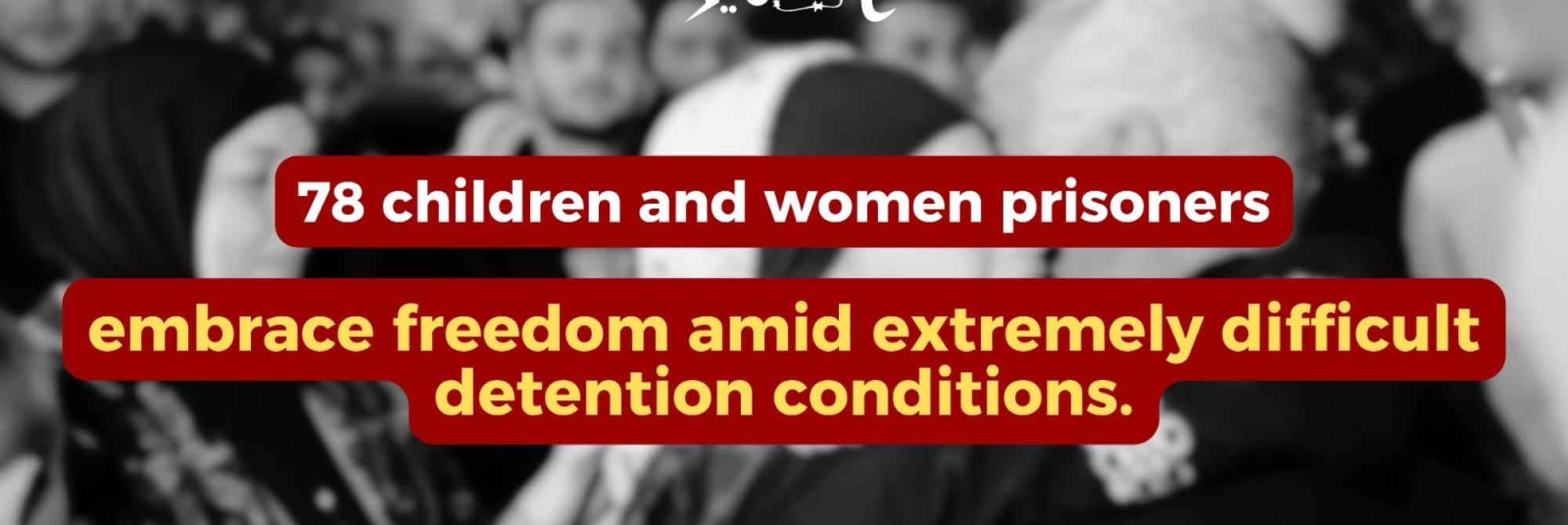 Since Friday evening, Israeli occupation authorities have released 78 child prisoners and detainees who have spent varying periods within the occupation's prisons. This came after a prisoner exchange deal with Hamas in Gaza as part of a truce agreement. It is expected that the occupation authorities will gradually release a total of 150 male and female prisoners from the West Bank and occupied Jerusalem during the days of the truce, in exchange for the release of several Israeli prisoners in Gaza. In the past few days, 30 female prisoners have been released, including four administrative detainees, and 14 prisoners serving varied sentences, the highest is the released prisoner Shorouq Dwayyat, sentenced to 16 years. Among those released were also several injured prisoners, including Israa al-Ja'abees, who suffers severe burns, and Fatima Shaheen, who lost the ability to walk after being shot by the occupation forces.