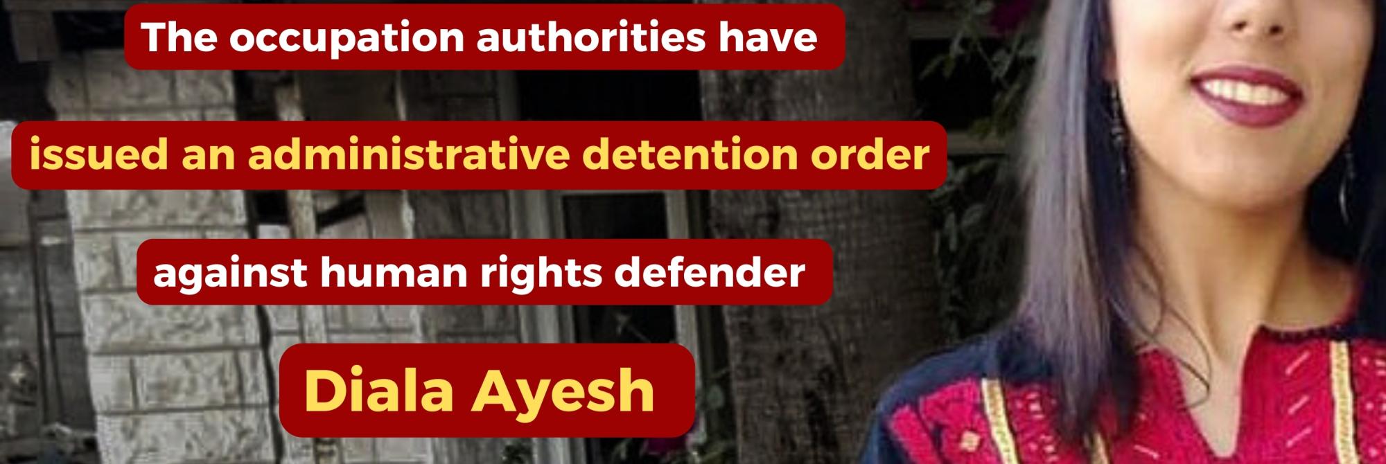 Ramallah - Addameer: Today, Thursday 25/01/2024, the occupation authorities issued an arbitrary administrative detention order against the activist lawyer and human rights defender Diala Ayesh from the city of Al-Bireh for a period of four months, ending on May 16, 2024. Diala was arrested while passing through the military "Container" checkpoint that separates cities in the southern West Bank from the rest of the provinces. She was subjected to assault, threats, and insults by occupation soldiers during her arrest. The occupation army transferred Diala after her arrest to the "Hasharon" prison under difficult conditions, placing her in a cell of very poor conditions with an open window despite the cold weather. The next day, the occupation transferred her to the Damon prison.