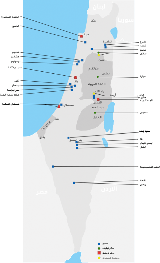 - Ashkelon Central Prison :This prison was founded during the British Mandate as a headquarters for British army leaders in Ashkelon and its surrounding areas. It was also used as a royal palace to host official British delegations. Within Ashkelon palace, one branch was designated as an interrogation center to crackdown on revolutionary fighters, after the defeat of 1967 which was met with escalated resistance as part of the national struggle against the occupation as well as a significant increase in the number of prisoners. Ashkelon prison was founded to receive Palestinian prisons beginning from 1970; its opening was one of the bloodiest of its kind, hence its coming to be known as “al-tashreefa”—referring to the prison guards forcing of prisoners to pass in between two lines from the prison gates to the prison cells and rooms while beating them with batons all over their bodies.