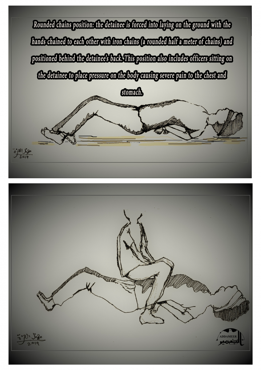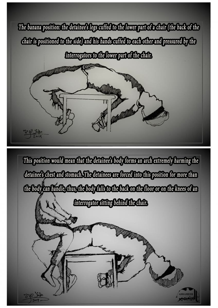 Following one week of intense interrogation, the interrogators threatened Ameer with harming his father who was brought to al-Mascobiyya interrogation center for questioning in an attempt to pressure Ameer. During the second week of interrogation, one of Ameer’s interrogation sessions lasted for two continuous days, with only ten-minutes breake for the meals. Interrogators used a number of stress positions against Ameer. These positions included the banana position,[33] and another position, in which Ameer would be standing on his toes and hands cuffed above his head to a wall behind him. This position would inflict extreme pressure on Ameer’s hands, arms and shoulders, which would physically affect Ameer’s ability to balance himself and stand, not only on his toes, but even his ability to stand on his feet.
