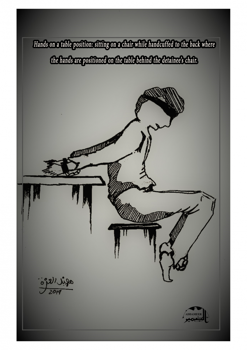 [9] Sitting on a chair while handcuffed to the back where the hands are positioned on the table behind the detainee’s chair. In this position the pressure would be mainly on the detainee’s shoulders. In Walid’s case, in specific, interrogators used to sit on his knees to pressure his chest to the back, and/or interrogators would pull his hands to the back to inflict further pressure on his shoulders, at the same time other interrogators would forcefully push his head (face) to the back.