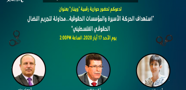 مؤسسة الضمير لرعاية الأسير وحقوق الإنسان تدعوكم لحضور الحوارية الرقمية (الويبينار)بعنوان: "استهداف الحركة الأسيرة والمؤسسات الحقوقية...محاولة لتجريم النضال الحقوقي الفلسطيني"
