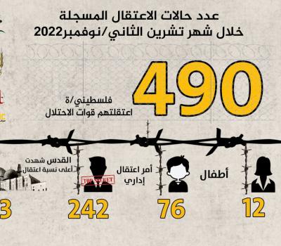 مؤسسات الأسرى: الاحتلال اعتقل (490) فلسطينياً خلال شهر تشرين الثاني/نوفمبر 2022
