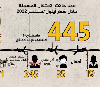 مؤسسات الأسرى: الاحتلال اعتقل (445) فلسطينياً خلال شهر أيلول/سبتمبر 2022