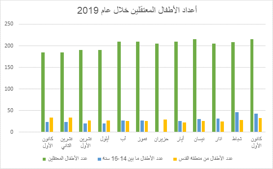 استمرت وتيرة سلطات الاحتلال الاسرائيلي في اعتقال الأطفال الفلسطينيين خلال عام 2019 وبخاصة الأطفال من منطقة القدس حيث شهد عام 2019 ما يقارب 800 حالة اعتقال لأطفال فلسطينيين كان من ضمنهم أطفال دون سن السادسة عشر. ويتوزع الأطفال على ثلاثة سجون بحيث يتمركز أطفال جنوب الضفة في عوفر، وأطفال شمال الضفة في مجدو وأطفال القدس في سجن الدامون.