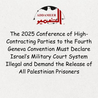 As the March 2025 Conference of the High Contracting Parties (HCP) to the Fourth Geneva Convention approaches, Addameer Prisoner Support and Human Rights Association urges all HCPs to take decisive action against Israel’s illegal military court system, which serves as a tool of oppression, mass incarceration, and apartheid against the Palestinian people.