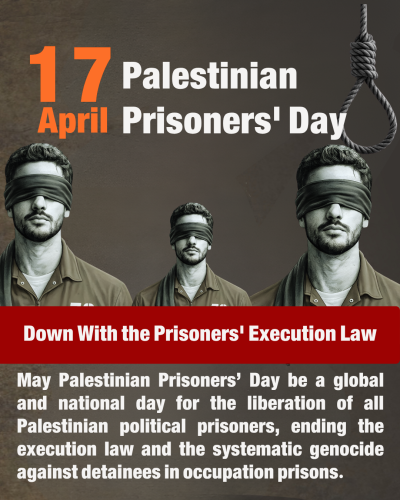 We call on our people and all those committed to justice worldwide to act—to mobilize, to organize, and to escalate pressure to overturn this law. Let Palestinian Prisoners’ Day be reclaimed as a day of action: to demand the liberation of political prisoners, to reject execution as policy and end the execution law, and to confront the system of destruction imposed upon them. Let it stand as a renewed national and global call: for freedom, for justice, and for an end to the machinery of murder.