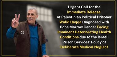 Immediate Release of Palestinian Political Prisoner Walid Daqqa Diagnosed with Bone Marrow Cancer and Facing Imminent Deteriorating Health Conditions due to Israeli Prison Services Policy of Deliberate Medical Neglect